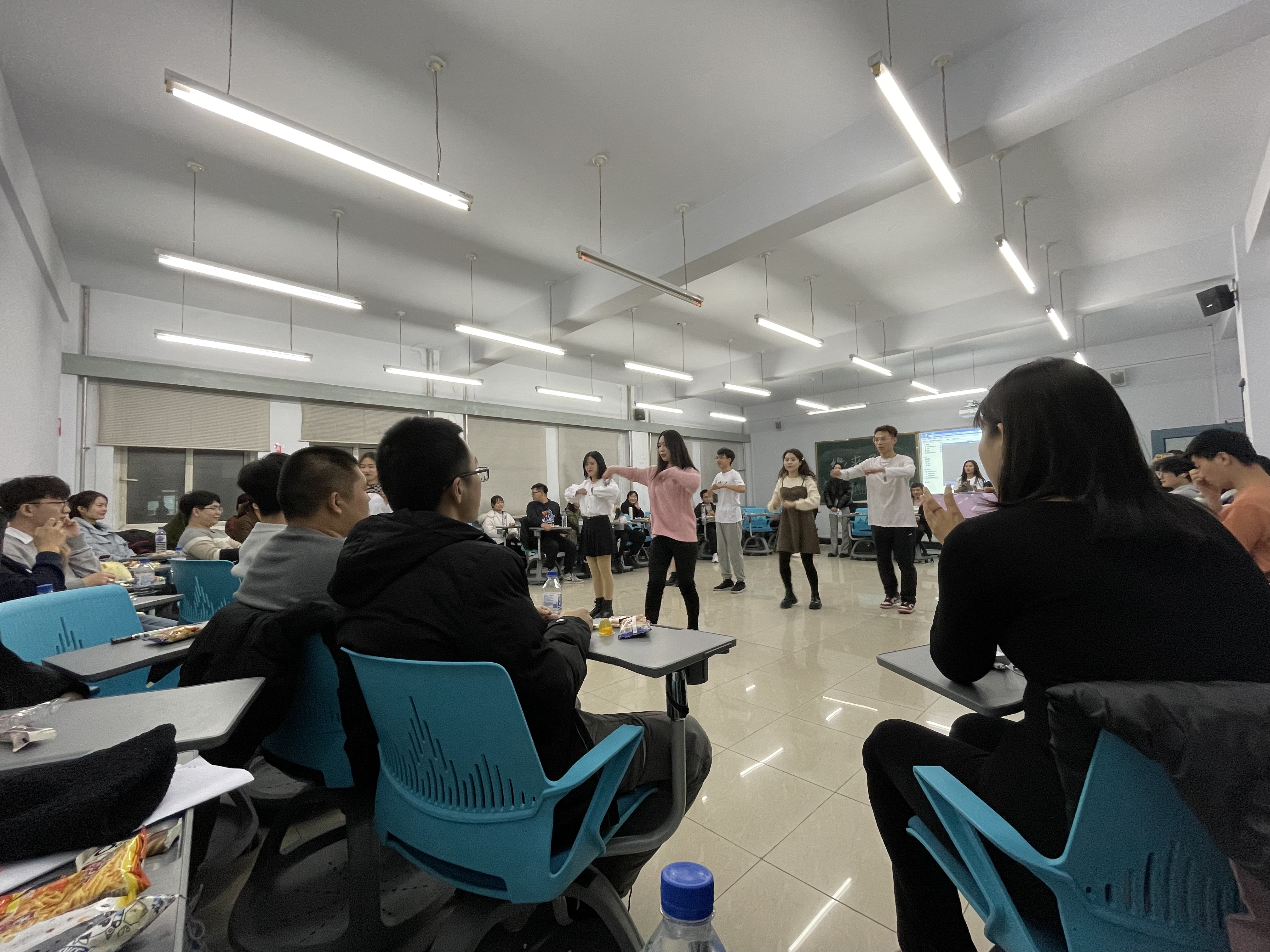 联谊开始,主持人分别介绍了两院的基本情况和联谊活动流程,并组织同学们进行自我介绍,增进了彼此了解。在游戏环节中,抓鸭子、传话筒和击鼓传花等各种游戏形式多样,色彩纷呈,同学们不仅乐在其中,更是在一片欢声笑语中拉近了彼此之间的距离,现场气氛十分活跃。才艺表演环节,化学学院彭鑫同学演唱《莫斯科郊外的晚上》、公共外语教育学院彭选同学演唱《忽然之间》、由洋和单春艳同学表演《Look what you make me do》和团体舞蹈《告白气球》,赢得了大家的赞许与掌声,将整场活动氛围推向高潮。