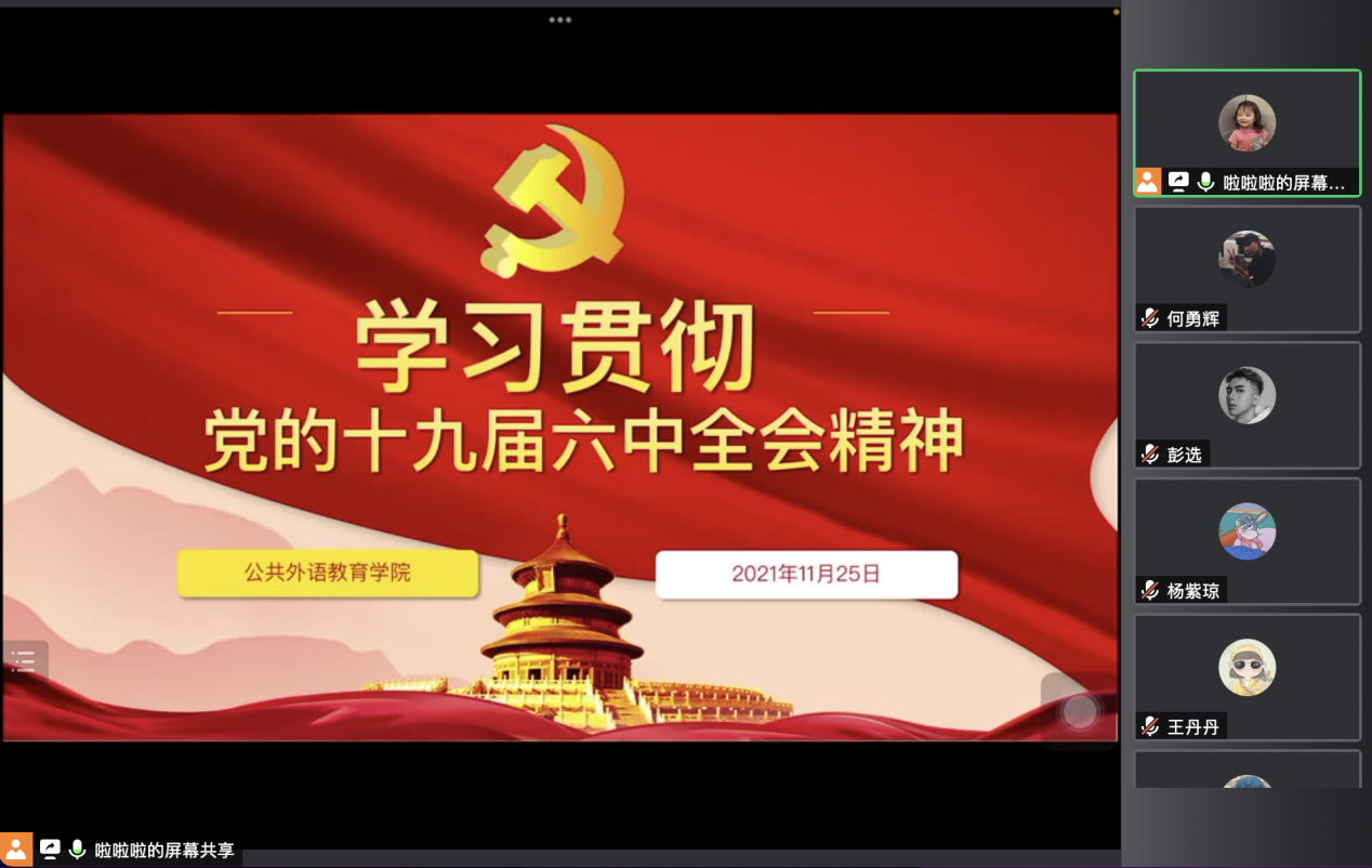 为深入学习贯彻党的十九届六中全会精神,深刻理解党百年奋斗的历史经验,深化学生干部爱党情怀,公共外语教育学院研究生会组织开展了“学习十九届六中全会精神”活动。2021年11月25日下午,公共外语教育学院研究生会全体成员以线上会议的形式,学习了十九届六中全会精神。本次会议由院研究生会主席曲哲主持,研究生会全体学生干部参与学习。