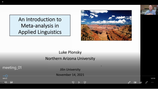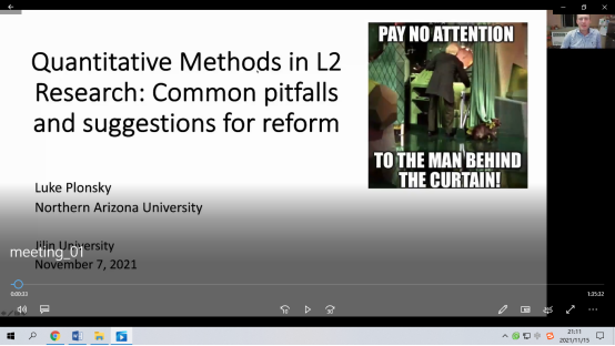 应乐竟官方网站邀请,国际知名应用语言学学者美国北亚利桑那大学Luke Plonsky博士,分别于2021年11月7日和14日,开展了研究生学术素养提升系列在线讲座,讲座由研究生定量研究方法课程主讲教师申云化老师主持。针对我院外国语言文学研究生的课程设置、论文选题与人才培养实际,Luke Plonsky博士分别以二语习得领域的“量化研究”和“元分析”为主题,进行理论爬梳、文献述评与实证分析。