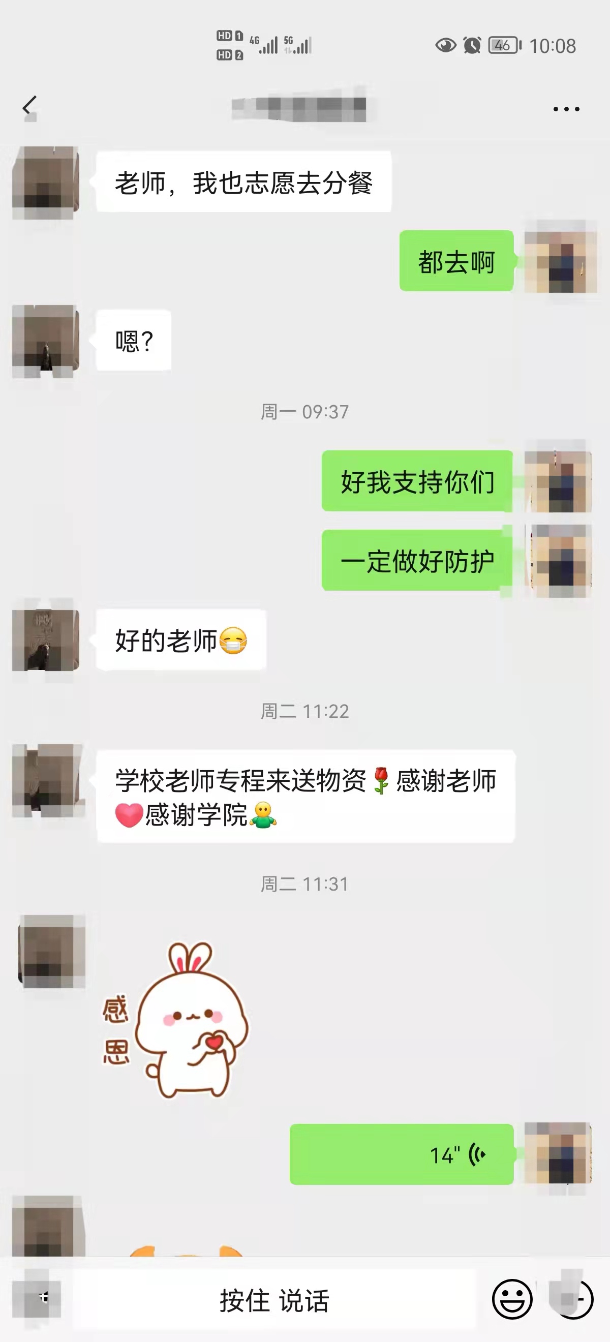 “孩子们安心,我跟你们在一起”,“我把家里和学院存的防疫物资给同学们送过去,大家在宿舍安心学习生活”,“大家开展志愿服务的同时,一定要注重个人防护”……学院辅导员曾媛老师不畏风险,坚持进校园陪同学们共渡难关。她深入了解学生状况,安抚学生情绪,将家中的物资倾囊相送。