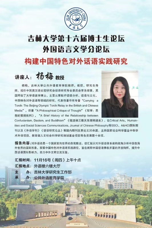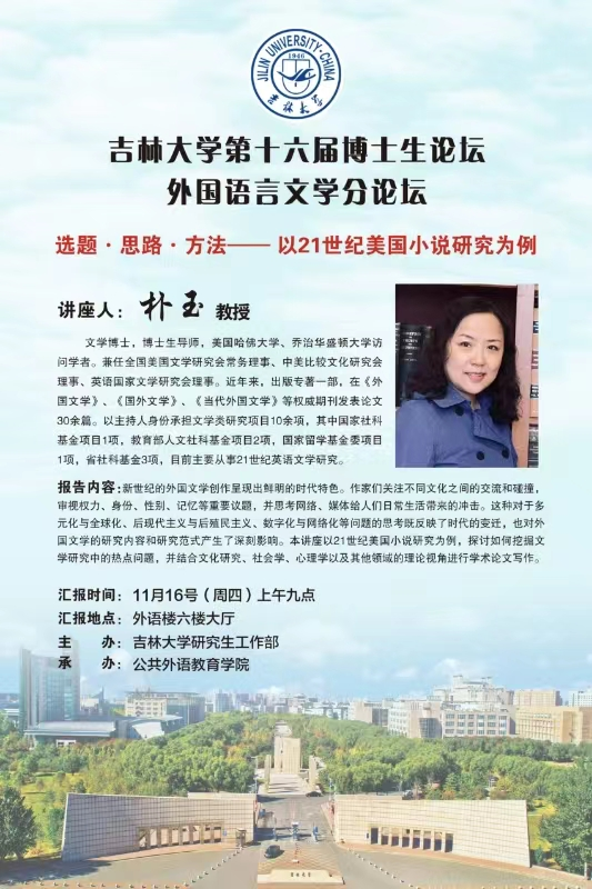 发言题目:选题·思路·方法—— 以21世纪美国小说研究为例 报告人:朴玉 乐竟官方网站 教授 报告时间:2023年11月16日9:00 报告地点:吉林大学中心校区外语楼六楼会议厅 发言题目:构建中国特色对外话语实践研究 报告人:杨梅 乐竟官方网站 教授 报告时间:2023年11月16日10:00 报告地点:吉林大学中心校区外语楼六楼会议厅