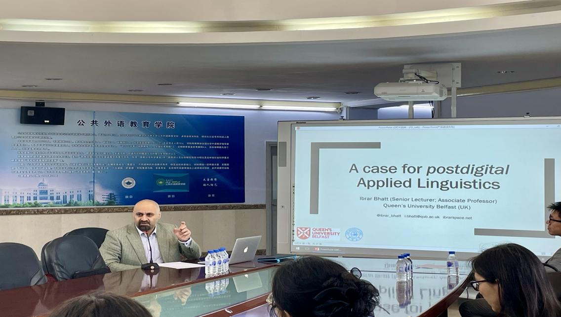 为庆祝吉林大学研究生院建院四十周年,2024年5月23日上午,公共外语教育学院特邀英国贝尔法斯特女王大学社会科学、教育和社会工作学院的Dr. Ibrar Bhatt副教授,在中心校区外语楼六楼会议厅做了题为“A Case for ‘Postdigital’ Applied Lingusitics”的学术报告。Dr. Ibrar Bhatt是高等教育研究学会理事会成员,研究方向涵盖应用语言学、高等教育和数字人文学科,是《Teaching in Higher Education: Critical Perspectives》期刊的执行编辑,并担任《Postdigital Science & Education》期刊的编委会成员。此次报告会由副院长姜峰教授主持,学院硕士、博士研究生参加了本次活动。