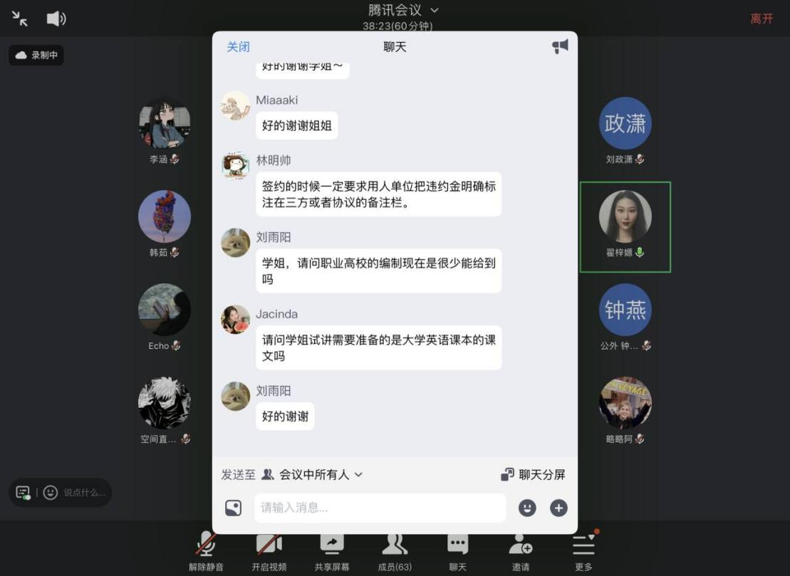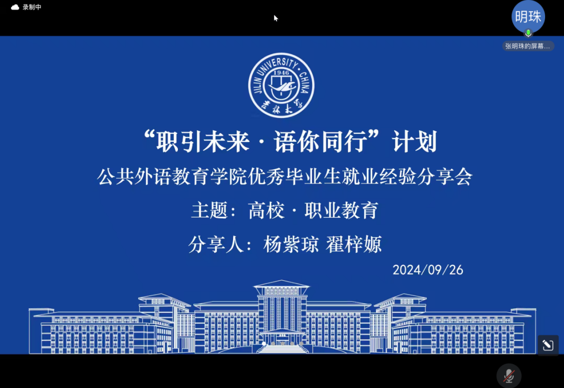 为引导学生树立正确就业观择业观,帮助大家快速了解就业形势,积累职业技能经验,公共外语教育学院于2024年9月26日晚举办“高校·职业教育”就业经验分享会此次分享会由学院就业兼职辅导员张明珠主持,学院2024届毕业生杨紫琼、翟梓嫄主讲,研究生辅导员林明帅和各年级研究生同学线上参会。