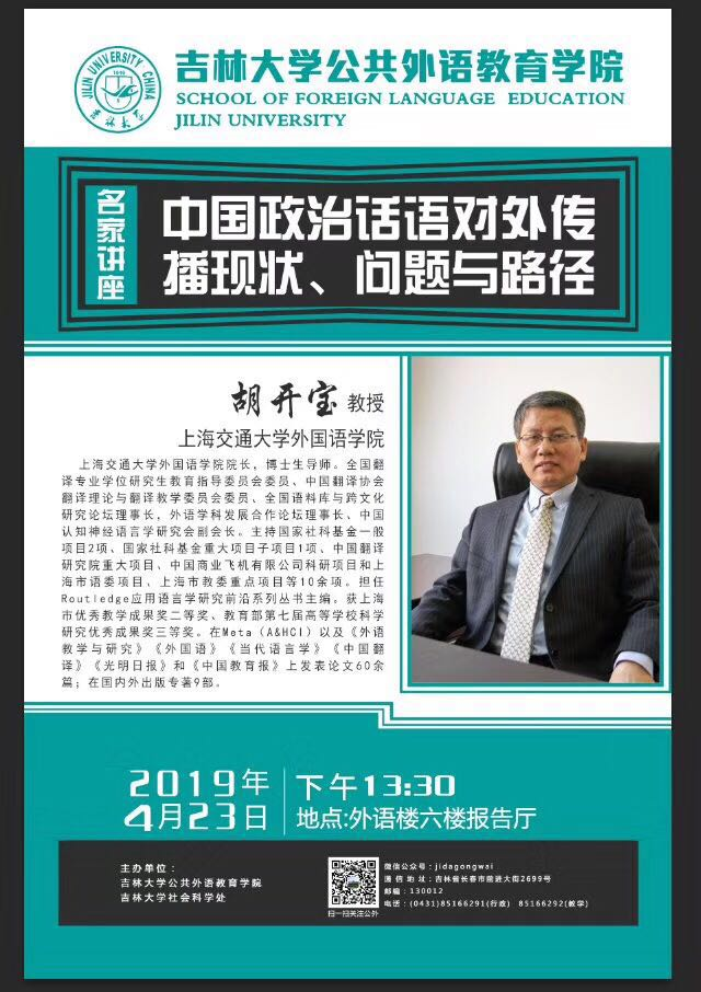 报告题目:中国政治话语对外传播:现状、问题与路径报 告 人:胡开宝 教授 上海交通大学外国语学院 院长讲座时间:2019年4月23日下午13:30讲座地点:中心校区外语楼六楼报告厅主办单位:乐竟官方网站 吉林大学社会科学处