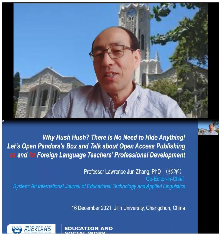 应公共外语教育学院邀请,国际知名应用语言学学者新西兰奥克兰大学Lawrence Jun Zhang(张军)教授于2021年12月16日举办题为“Why Hush Hush? There Is No Need to Hide Anything! Let’s Open Pandora’s Box and Talk about Open Access as andfor Foreign Language Teachers’ Professional Development”的专题线上学术讲座。该讲座为我院“新文科、新发展、新思考”庆祝吉林大学建校75周年外国语言文学系列讲座之一。讲座由徐志卿博士主持,院长潘海英教授、我院教师及研究生代表参加了本次讲座。