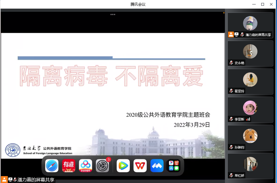 为进一步做好疫情防控宣传,提高同学们的疫情防控意识和自我安全意识,3月29日,公共外语教育学院2020级全体学生召开了以“隔离疫情·不隔离爱”为主题的班会活动。