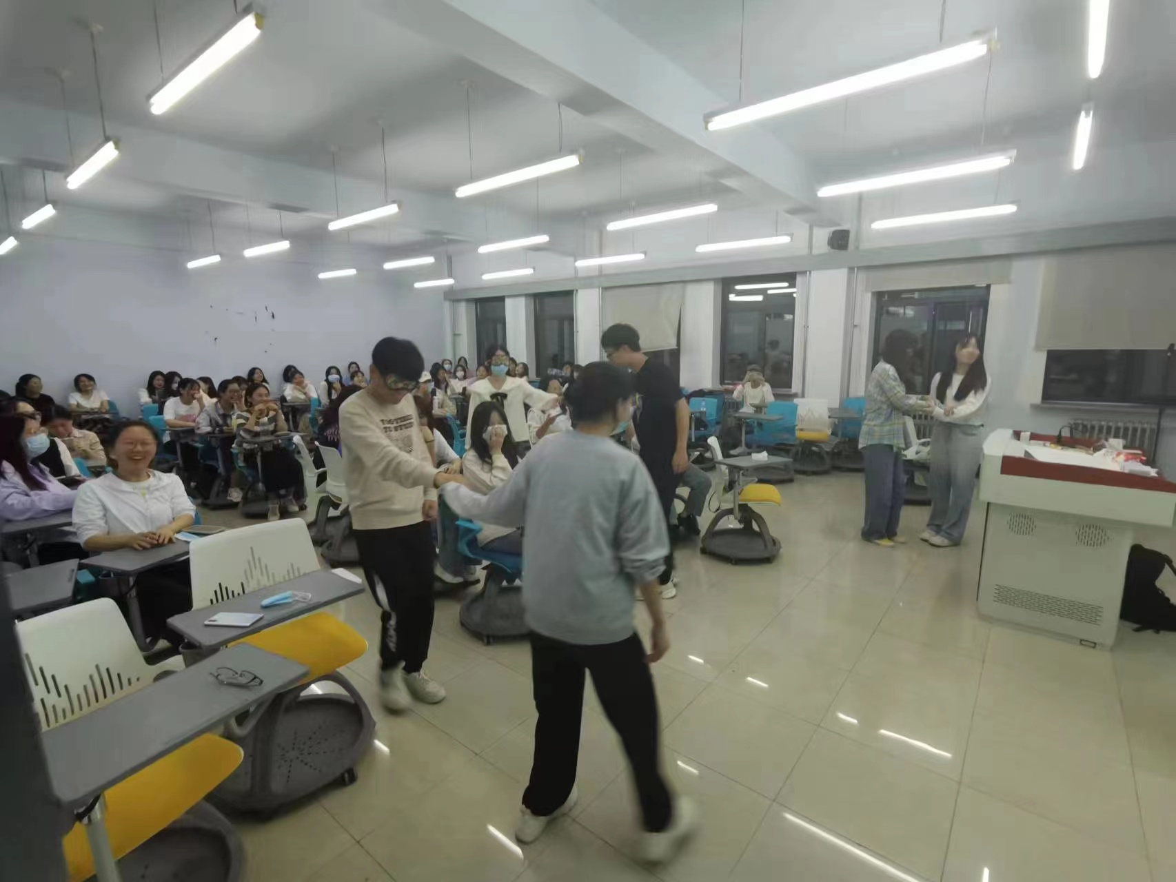 过渡阶段,“你比我猜”将整场活动的气氛推向了高潮。赛后,主持人为参赛全体同学设置了颁奖仪式,在慷慨激昂的音乐下,主持人按照成绩为参赛选手发放奖品。随后的“信任之旅”游戏成为了破冰行动的关键,在引路人的指导下,戴上眼罩的“盲人”绕过障碍抵达终点,并在摘下眼罩的那一刻,找出自己的引路人。在活动的末尾,建立起信任关系的同学们在轻松的氛围中发出了掌声。