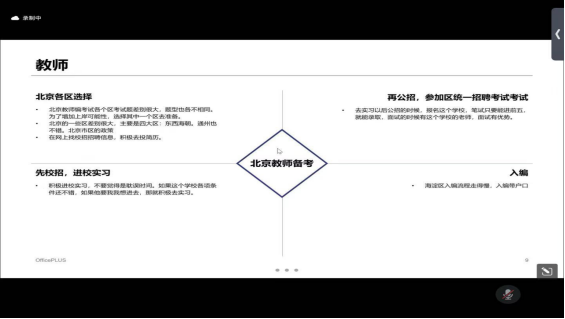 王钰阁以个人成功考取北京地区教师编的经历为例,详细分享了她的备考心得。王钰阁从职业选择、信息获取、备考和考试、入职经历、北京学校待遇和她所在学校的具体待遇五个方面作了详细的分享。她鼓励同学们在求职过程中要调整好自己的心态,拒绝焦虑情绪;她还根据自己信息搜集经验,向同学们推荐了一系列实用的公众号和书籍资源等。王钰阁还积极向同学们介绍了北京地区教师的待遇情况和工作作息安排。她希望通过自己的分享,能够使同学们“少一点信息差,多一点上岸的概率”。